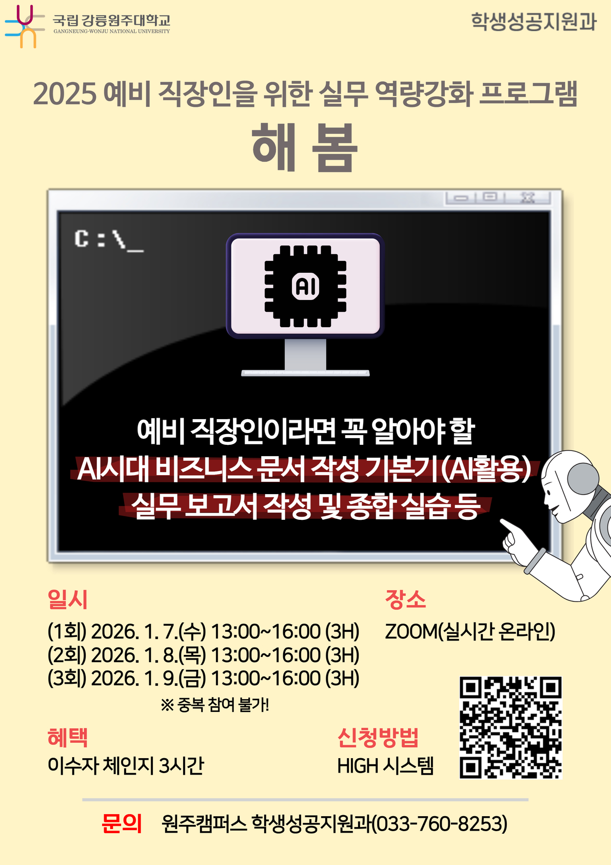 [학생성공지원과] 2025학년도 동계방학 잡카페 소규모 특화 프로그램 「예비 직장일을 위한 실무 역량 강화_해봄」 운영