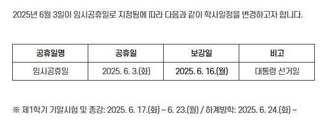 임시공휴일(6/3) 지정에 따른 학사일정 변경 안내