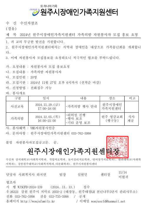 2024년 원주시장애인가족지원센터 가족의밤 자원봉사자 모집