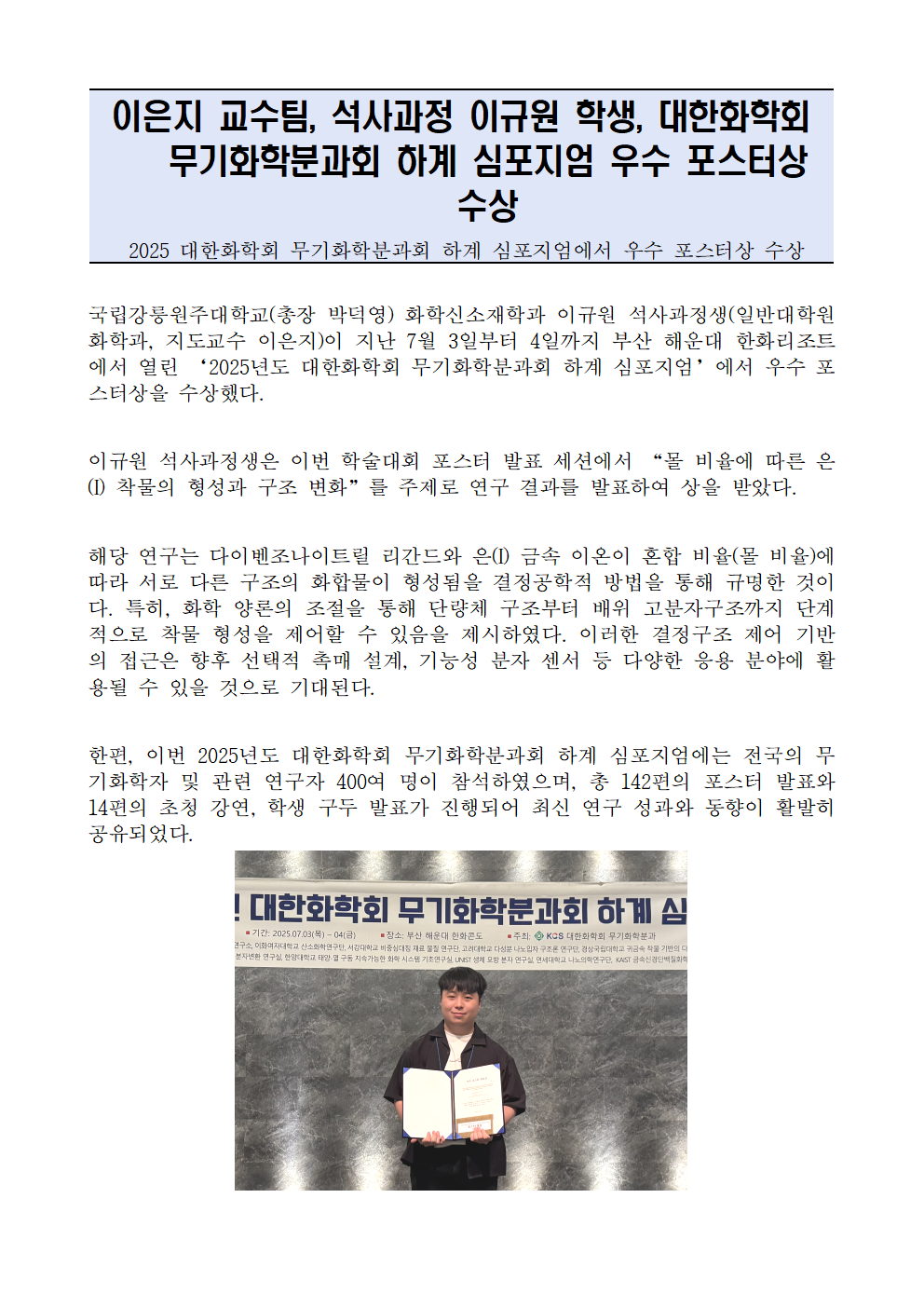 fnctId=bbs,fnctNo=990 이은지 교수팀, 석사과정 이규원 학생, 대한화학회 무기화학분과회 하계 심포지엄 우수 포스터상 수상 작성일 2025.07.08 작성자 진미영 조회수 1696 첨부파일 첨부파일이(가) 없습니다.