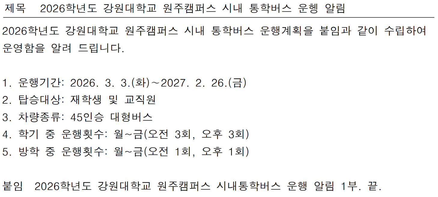 fnctId=bbs,fnctNo=877 2026학년도 강원대학교 원주캠퍼스 시내 통학버스 운행 알림 작성일 2026.03.04 작성자 정하나 조회수 12 첨부파일 ★(알림) 2026학년도 시내통학 운행알림2026. 3.-5-1.hwp
