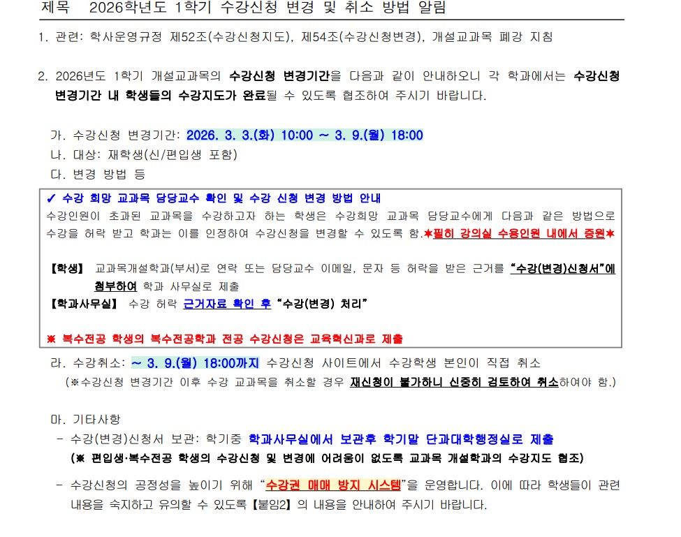 fnctId=bbs,fnctNo=642 2026학년도 1학기 수강신청 변경 및 취소 방법 알림 작성일 2026.02.26 작성자 노종민 조회수 186 첨부파일 2026학년도 1학기 수강권 매매 방지 시스템 운영 안내(수강신청 변경기간).hwp 수강신청 변경 신청서(2026).hwp