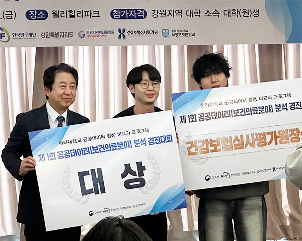 산업경영공학과 김광호(팀장, 4학년), 김준우(3학년) 학생이 지난 2024년 12월 5일(목) ~ 2024년 12월 6일(금) 강원도 횡성군 소재 웰리힐리 파크에서 열린 ‘공공데이터(보건의료분야) 분석 경진대회’에서 ‘대상’을 수상했다. 공공데이터(보건의료분야) 분석 경진대회는 건강보험심사평가원과 강원지역혁신플랫폼 사업의 일환으로 대학생으로 구성된 팀들이 참여하는 대회다.
