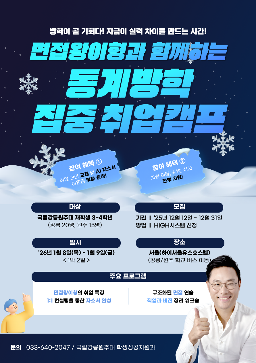 fnctId=bbs,fnctNo=871 [학생성공지원과] 「면접왕이형과 함께하는 동계방학 집중 취업캠프」 작성일 2025.12.15 작성자 최지은 조회수 322 첨부파일 첨부파일이(가) 없습니다.