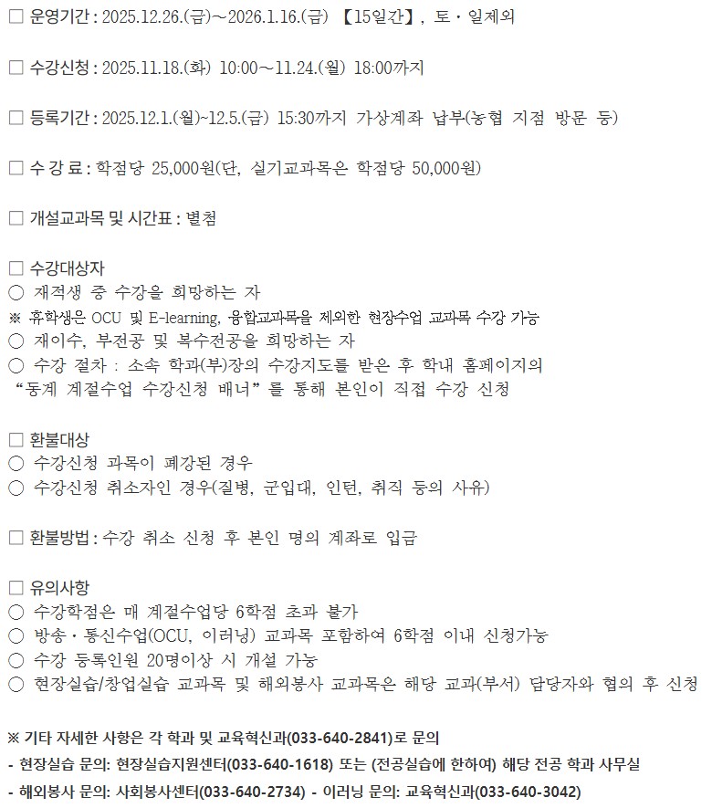 fnctId=bbs,fnctNo=793 2025학년도 동계 계절수업 수강신청 및 등록안내 작성일 2025.11.12 작성자 이경란 조회수 382 첨부파일 2025학년도 동계 계절수업 공고문.hwp 2025학년도 동계 계절수업 개설교과목 및 시간표.xlsx