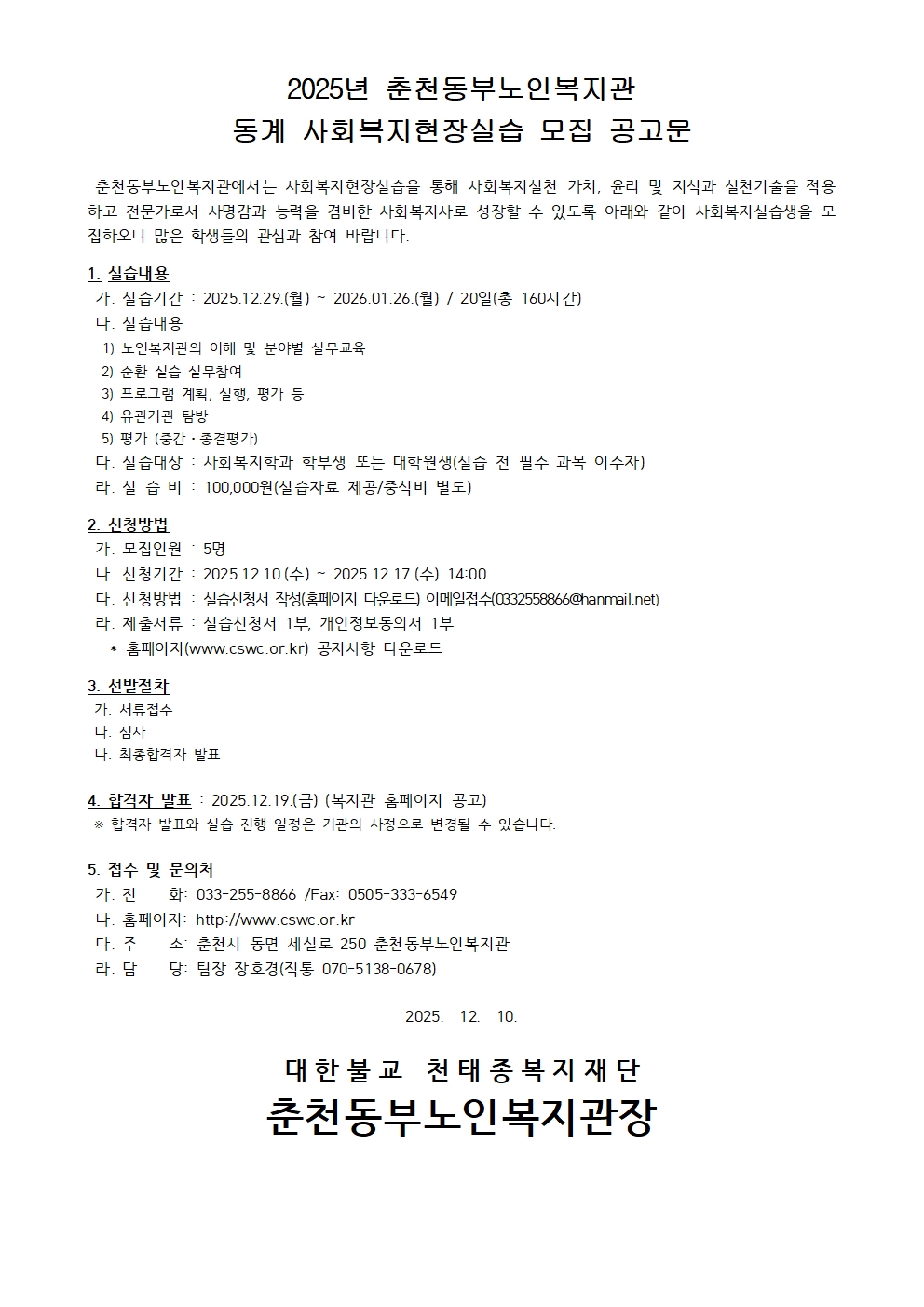 fnctId=bbs,fnctNo=849 [2026-동계] 춘천동부노인복지관 동계 실습생 모집 안내(~12.17.) 작성일 2025.12.15 작성자 박아름 조회수 364 첨부파일 붙임1) 공고문.hwp 붙임2) 신청서.hwp